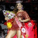 Darlin chegou vestindo um macaquinho branco com renda e transparências, coberto com cristais. Já para a coroação a ainda futura rainha mudou o look e usou um vestido vermelho, também com pedras e transparências, o que deixava amostra o micro short, que ela vestia por baixo.